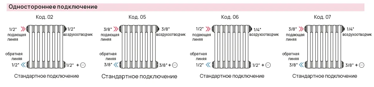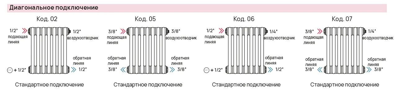 | Количество трубок | Высота | Количество секций | Цветовой код | Код упаковки | Код подключения | ||